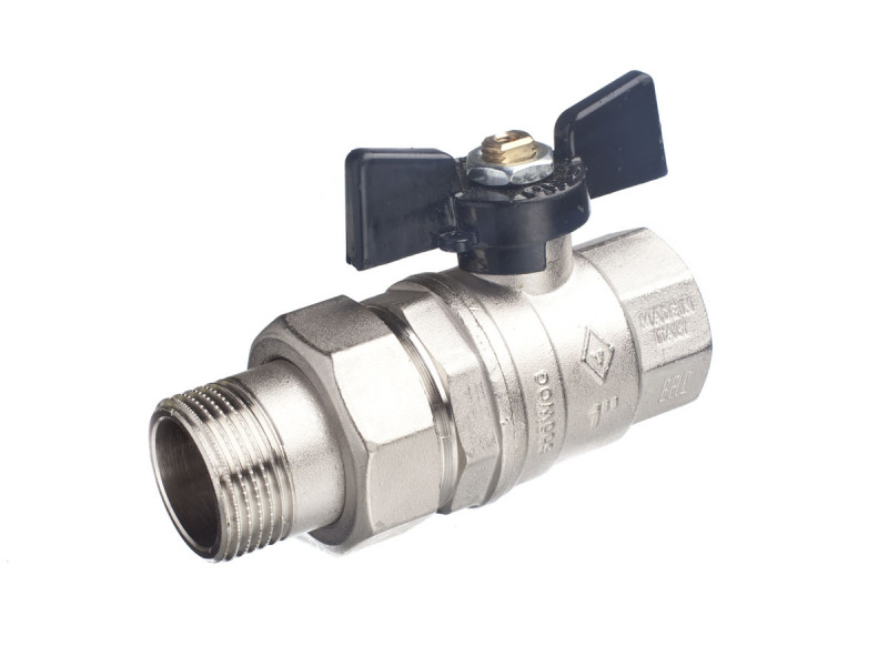 Кран шаровой латунный, полнопроходной, резьбы внутренняя - наружная (соединитель с накидной гайкой) по ISO 228/1.