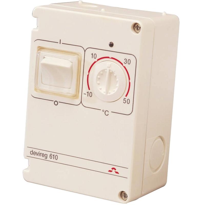 Терморегулятор Devireg™ 610 с диапазоном температур от -10°C до +50°C используется для установок внутри и снаружи помещения. Особенность этого терморегулятора — возможность его установки снаружи помещения. Влагозащищенность — IP 44.