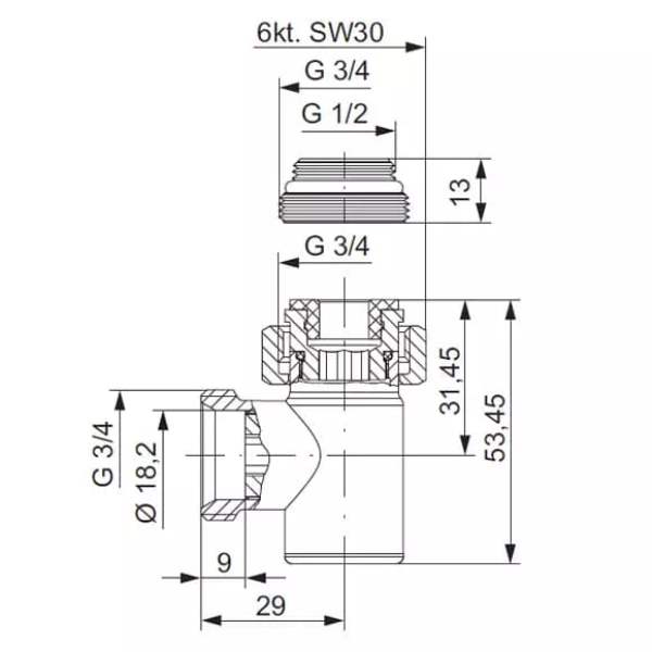 Одиночная соединительная арматура (обратная подводка), с плоским уплотнением EPDM (тефлон) 3/4 и ниппелем из латуни 1/2*3/4 с шаровым краном с жёстким упором, угловой, Hummel Designtechnik (2456853502) хром