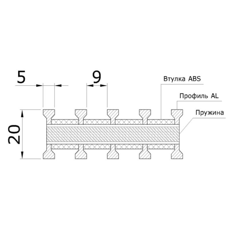 Решетка состоит из алюминиевых планок, соединенных между собой гибким тросом. Между планками вставлены алюминиевые втулки, с помощью которых получают равномерное расположение планок. Расстояние