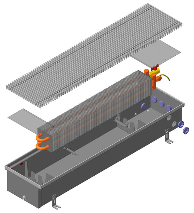 Данный вид конвекторов устанавливается в помещениях, в которых предусмотрена двухтрубная схема и насосные системы отопления. При установке внутрипольных конвекторов с принудительной