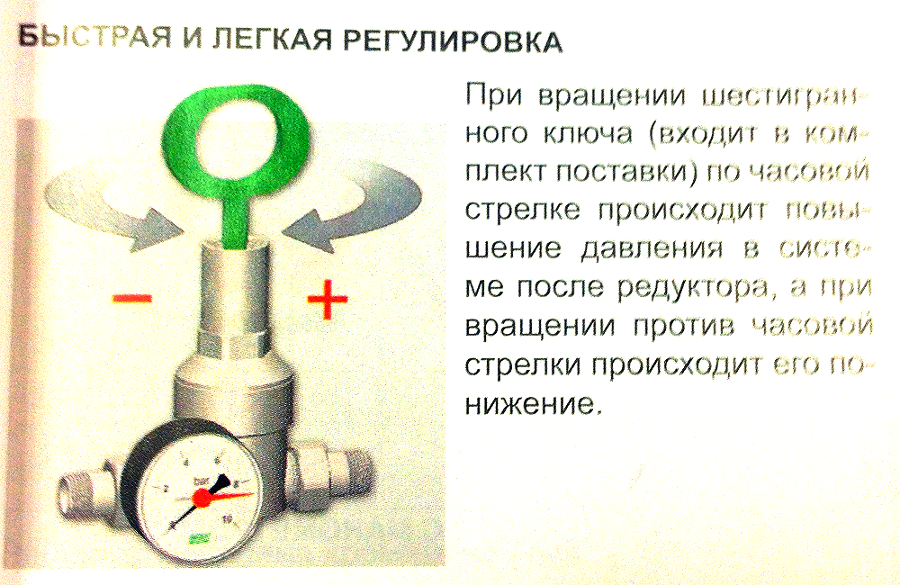 Основная цель редуктора - это сохранение постоянного давления в системе водоснабжения квартиры или дома, при условии , что давление до редуктора – может колебаться в широких пределах – связанное с потреблением воды во всем доме или на магистральной линии к дому.